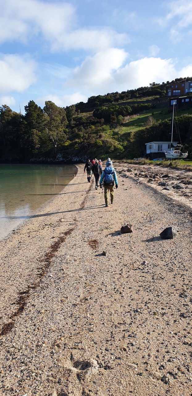Following lunch the Standards returned along the coastal track to their pickup point at Charteris Bay. The Alternates carried on for a short time towards Purau, truncating their walk due to time restrictions and the lure of the nearby café/ice cream shop. Before long the Alternates were back at Diamond Harbour, wearing clean footwear, enjoying refreshments and relaxing in the sunshine. But not before one keen walker paced up and down the footpath to ensure that a bare 8km goal had been achieved. As the bus neared Charteris Bay, the Standards were finally sighted, a long line of walkers stretched out along the road, nearing the end of their 12km walk.