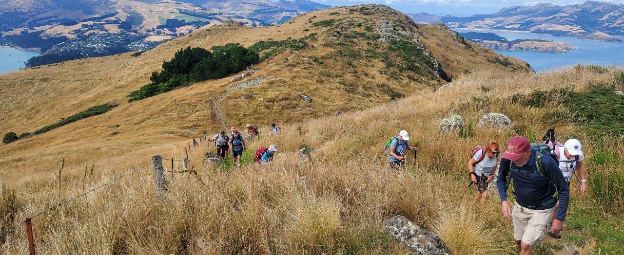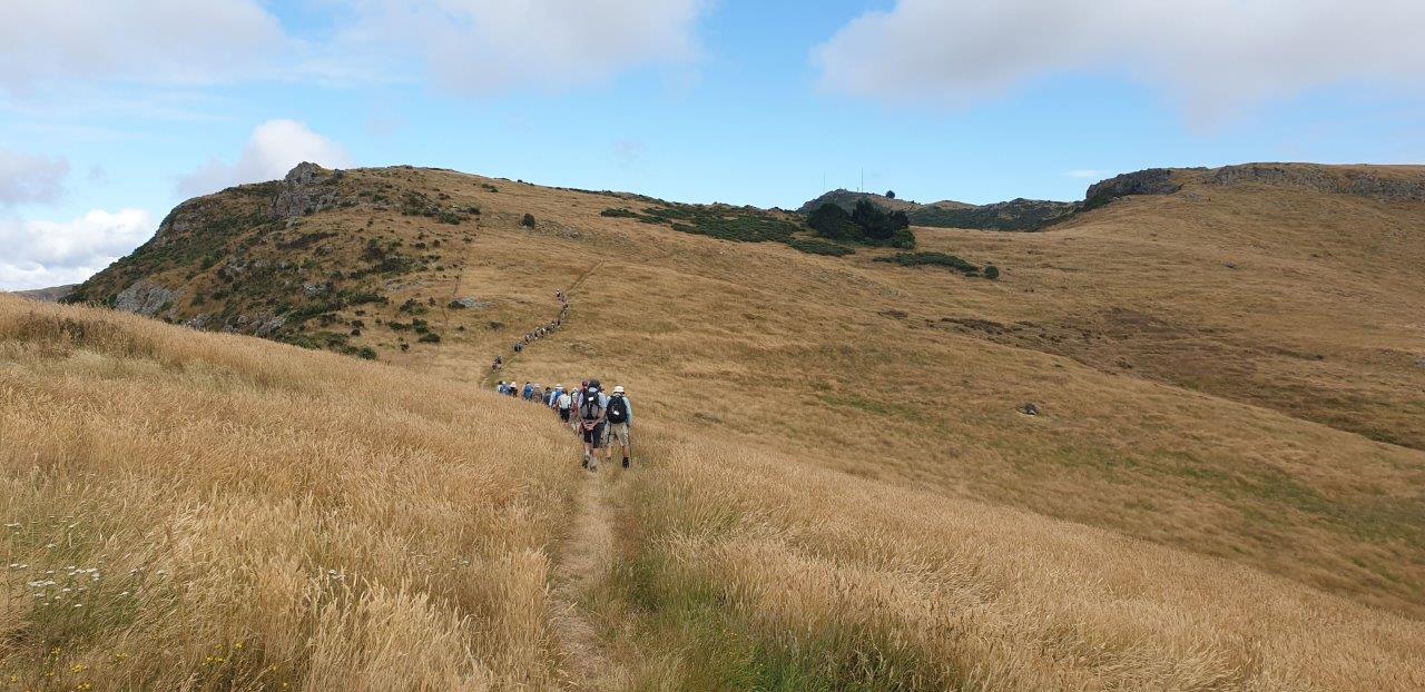 There’s something about these uphill stretches where head is down and what is seen is tussock grass, clover, yarrow, dried docks, blue flowers, yellow flowers, backs of legs, boots, rocks, socks, packs, with only the occasional glance to expanded views over harbour or city. Or so it seems.