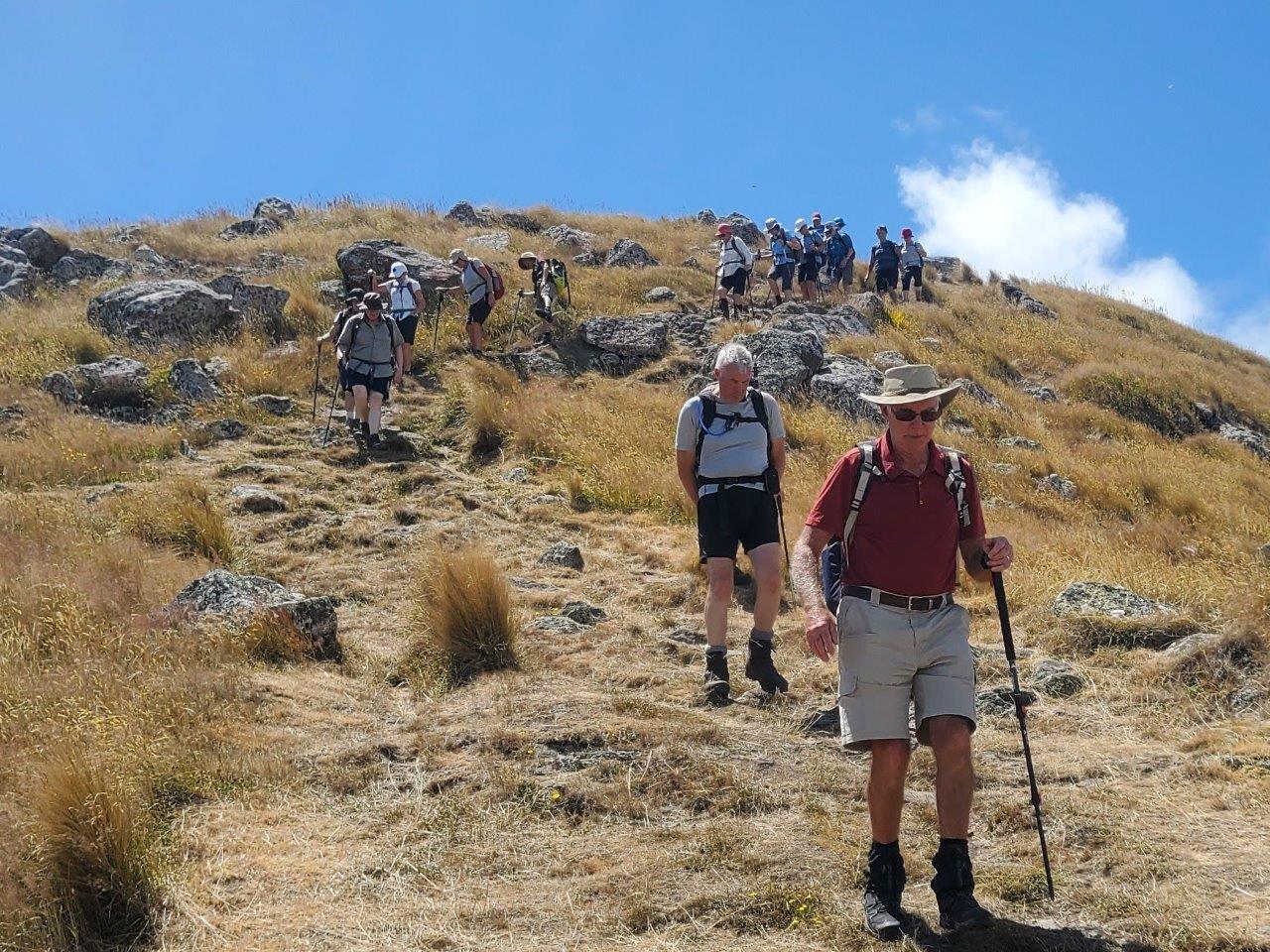 38 trampers including visitors, Brent, David and Les, alighted the bus at Bishopdale. We were dropped at Evans Pass where a 39th member joined us. We walked westward along the Crater Rim walkway, which is also part of the 360 Trail. Good cloud cover and a following breeze made for ideal walking conditions although there was an immediate climb.