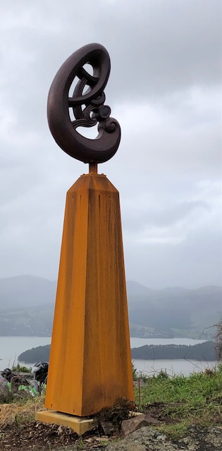 Across the road from the Bellbird is the recently opened John Jameson Lookout. The platform provides magnificent views over Lyttelton Harbour (not so much today) and features a new carpark, a low wall of Port Hills stone and panoramic panels pointing at significant places. John is the grandson of Harry Ell and a Life Member of the Summit Road Society.
