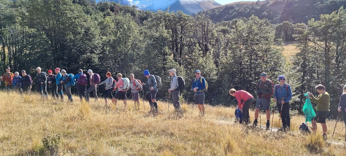 As the day wore on it got markedly chillier. There were some exposed zigzags from where we could see the Alternates lunching on the flat in the sun. The wind on the zigzags was keen enough to blow away words, destabilise footing and contemplate the need for ballast (a large rock?) in the packs of lighter trampers. Some of the Standard group stopped for lunch at the foot of the Hogs Back ridge, others scrambled to the top and took in views of places we’d walked – Camp Saddle, Lyndon Saddle and Helicopter Hill – and ate lunch in what one described as “the teeth of the gale”.