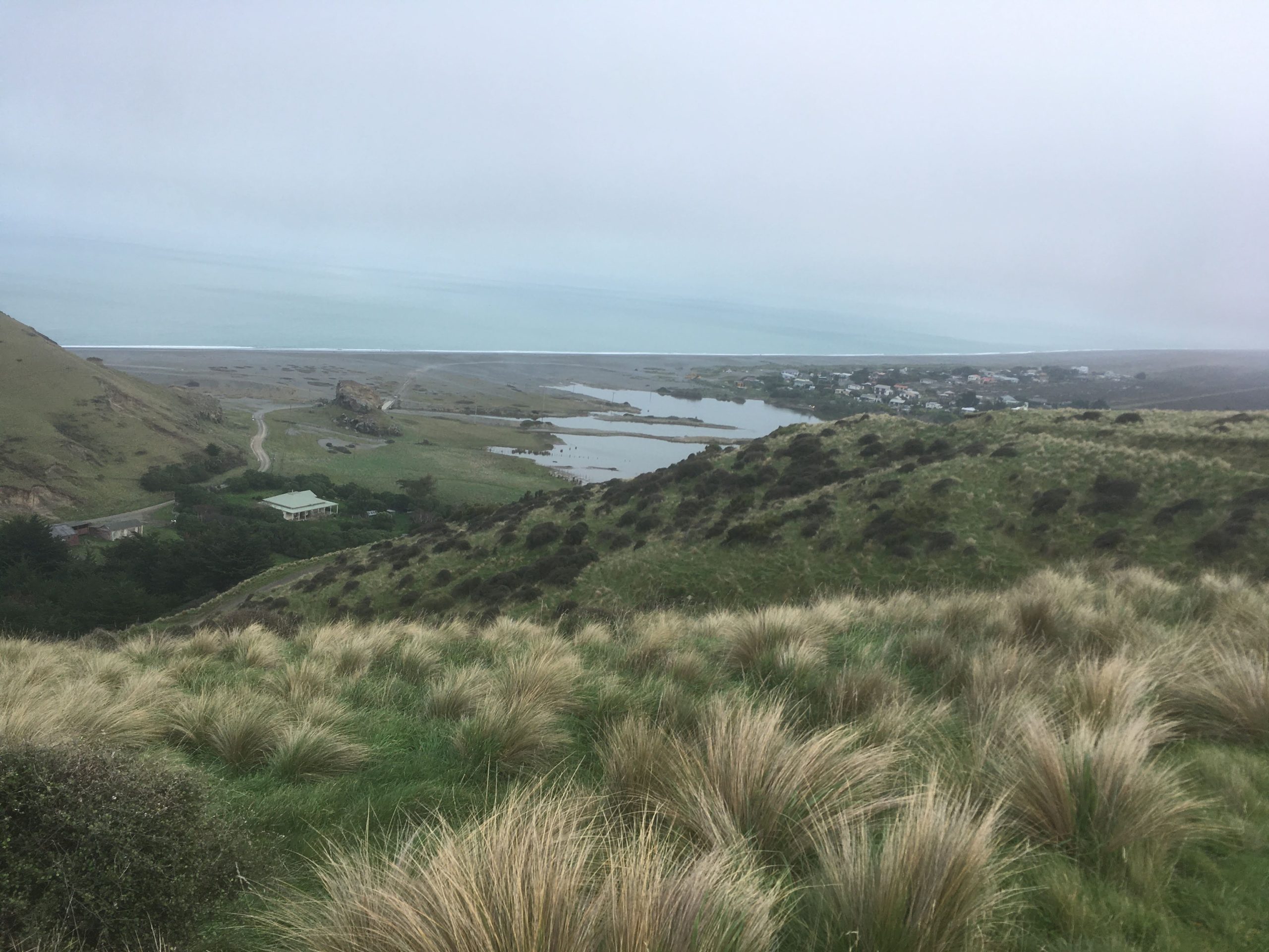 Our Standards group began to stretch out along the shingle road, then the dramatic sight of Birdlings Flat loomed in the distance when moments before there had only been fog. Walking down the last hill did nothing to dispel any notions of unworldliness – let’s face it, Birdlings Flat really is a rather bizarre place. There’s the almost lunar terrain covered in those curiously rounded stones we had to traverse as we made our way towards the quirky little settlement. And as Kate wrote in her trip report in 2020, if she were ever to write a crime novel, then Birdlings Flat would be the perfect setting, with all the fascinating characters who reside there.
