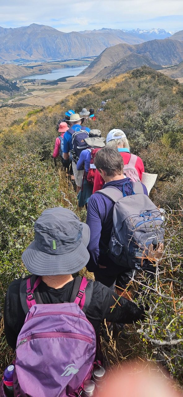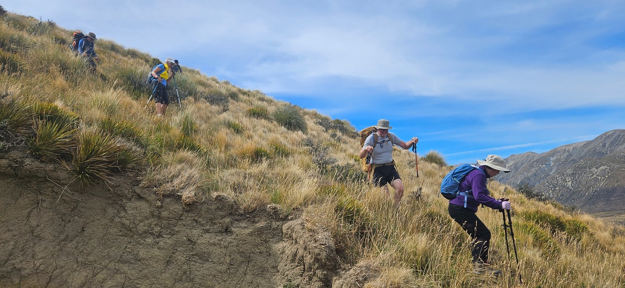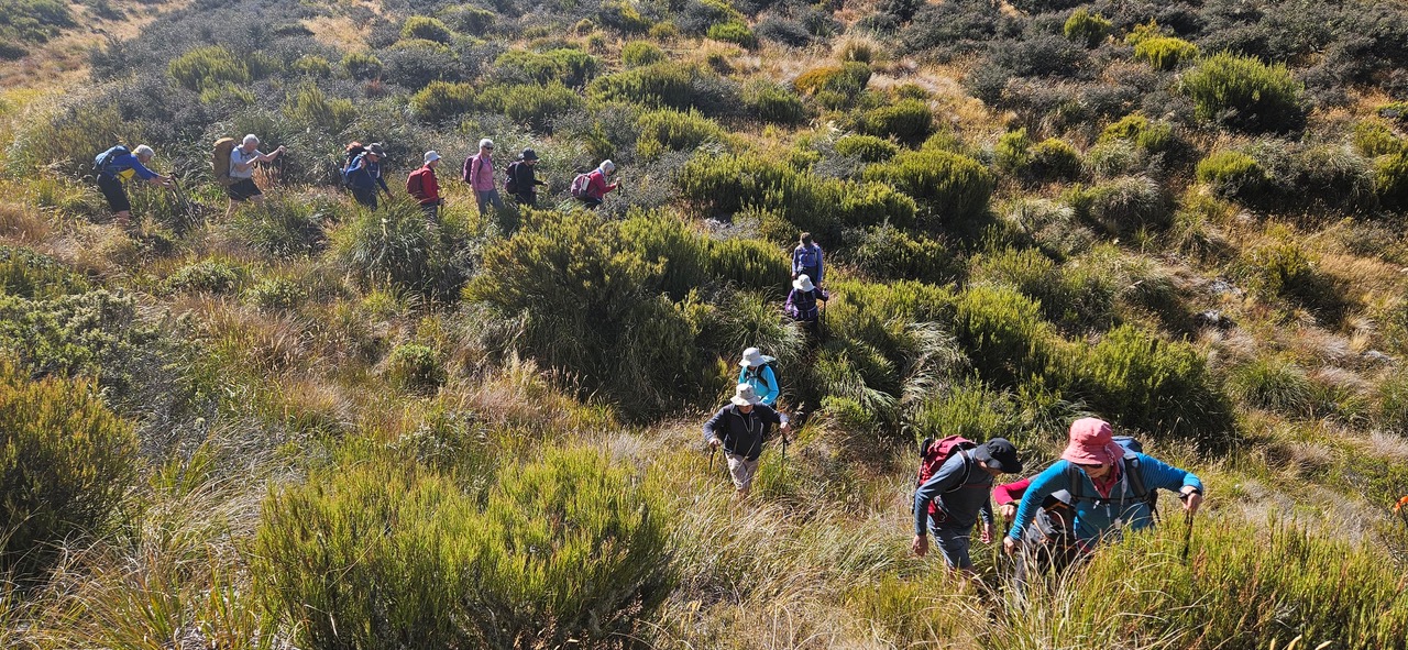 With no real track it was slow going, especially for those at the front forging their way through the matagouri and tussock and on uneven ground warning those following with occasional shouts of “Hole”! Back on firmer ground at the top of the ridge, the standards could be seen across the gully in the distance.