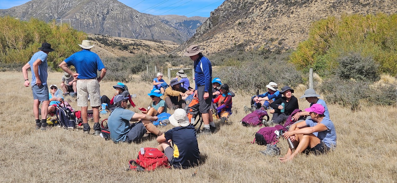 Reaching the base of Boundary Hill, some elected to have lunch at the bottom, while 13 of the group trekked up the narrow path to the top. The view from the top of the hill taking in Lake Coleridge and the Rakaia River with a smattering of snow on the distant mountains was well worth the climb, and there was still plenty of seating in the sun for the standards when they arrived a short time later.