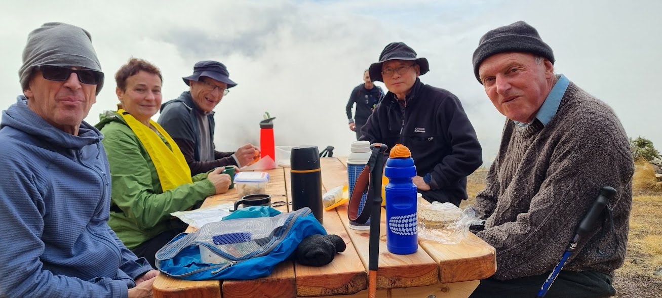 It was only 1.30 when both groups made it back to the bus waiting for us in the Kura Tawhiti carpark. Driver Callum drove us skilfully through the fog back over Porters Pass, and there was still time for a coffee/beer/ice cream at Darfield (and someone may even have decided they had earned a pie, despite today’s tramp being not much more than a mere 8km for the Alternates and 9km for the Standards).