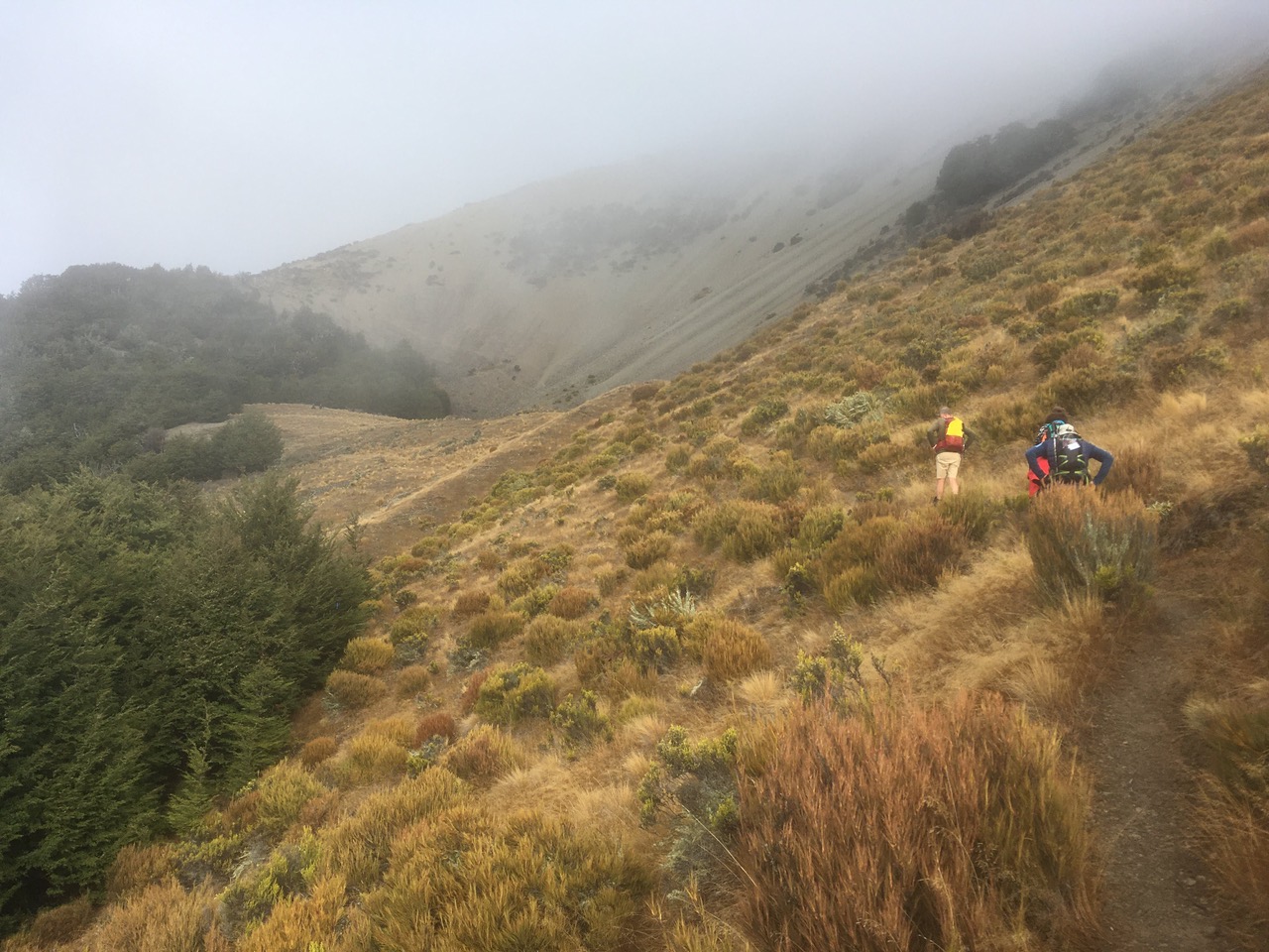 It wasn’t that long after morning tea that the 27 Standards emerged from the bush and made our way to our picturesque lunch spot, the lip of the Leith slump, with the fog-bound Mt Enys towering above. Some of the Alternates were enjoying the new picnic table there, but no one was raving about the view. Usually this is a stunning spot to look way down to Castle Hill Village, and across to Prebble Hill, but today it was still somewhat foggy and there were just tantalising glimpses to be had.