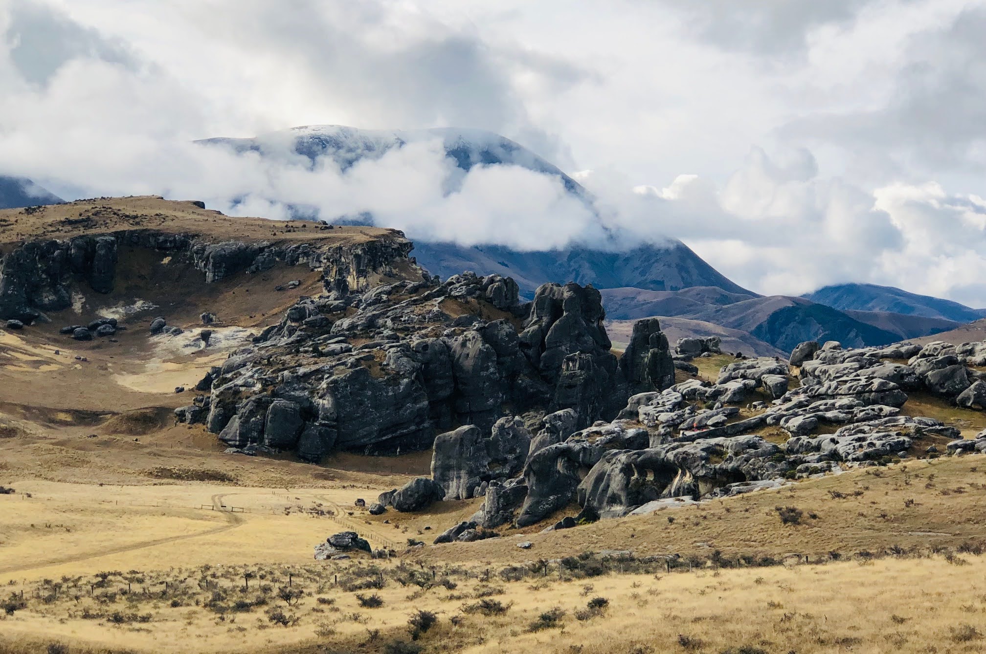 There may have only been 38 of us keen trampers (including guests Cait and Stuart) setting out from Castle Hill Village, but after about 10 days of drizzle and rain we were all set to enjoy this superb tramp. We definitely were ‘all set’ as there were gloves, raincoats, and even some over-pants donned in the expectation that we’d be trudging all day in the cold and wet. The fog we’d encountered along the way had done nothing to make us feel more confident about the weather. However, within half an hour of steady uphill walking, multiple layers were shed as the weather was actually quite pleasant.