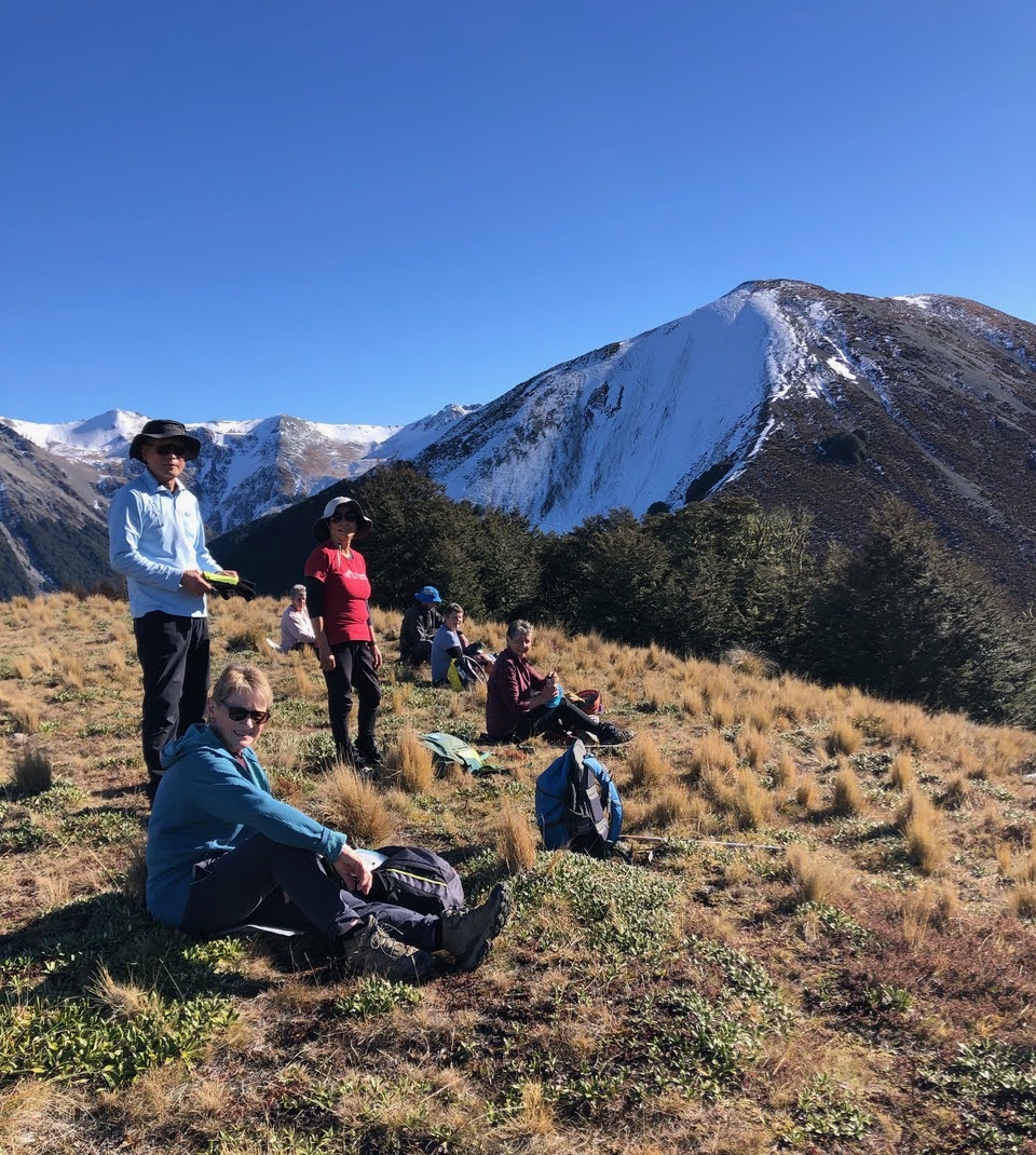 On a crisp and clear late autumn morning 21 of the 33 trampers set out from Mistletoe Flat for this season’s Camp Saddle circuit. Judging by a few recent emails this trip was keenly anticipated. Also, being a little later than usual in the season and after a few southerlies over the last month, some discussion on the bus revolved around encountering snow and ice on the route. We were not disappointed.