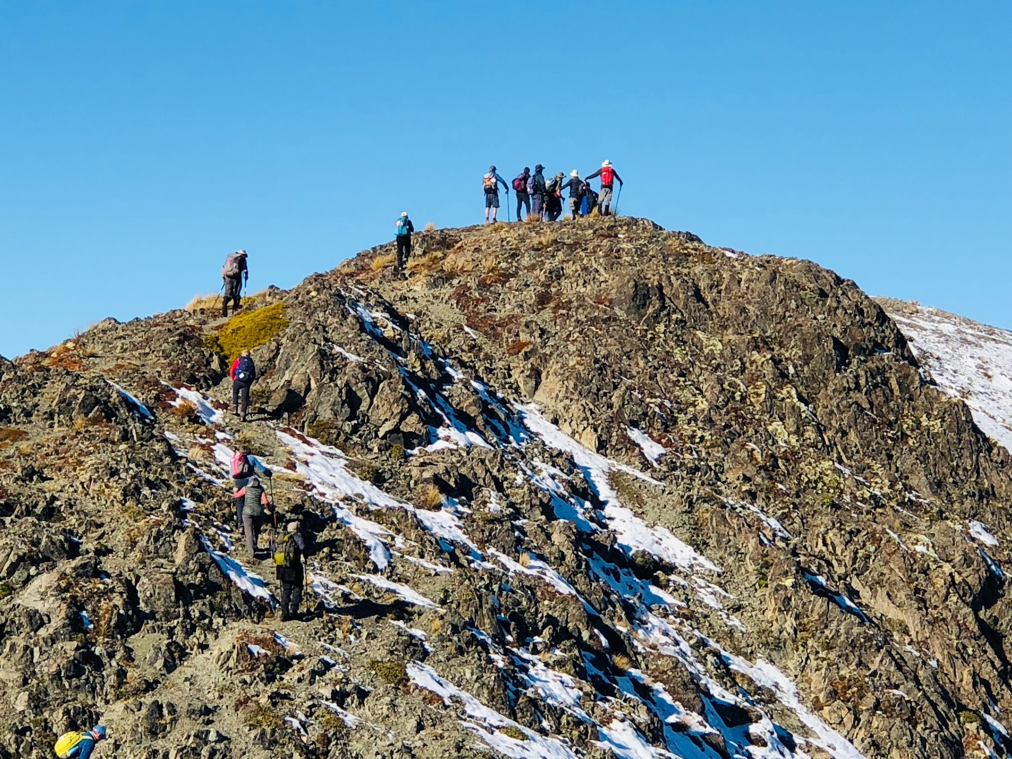 After our lunch break we walked for about 3km along the undulating and, in some parts, gnarly south east ridgeline encountering light snow and ice in patches where careful footing was required. Everyone negotiated this travel well which brought us to the top of the scree slope for our descent and access, for our return, via the Luge/Mistletoe track.