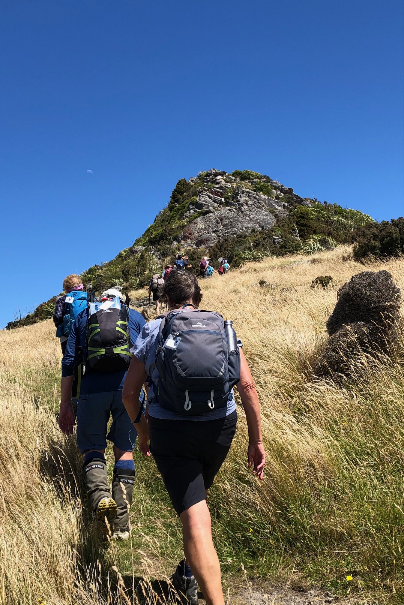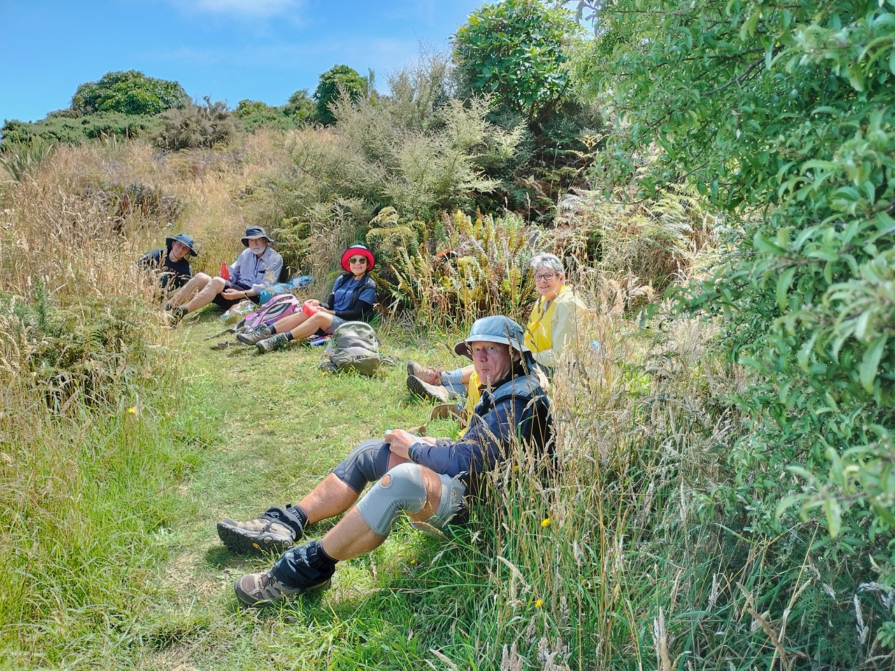 After tea, the Alternates continued on the Crater Rim Walkway, through bush and brush and flax, over hill over dale, and up and down the rocky passages, all in typical BTC tramp fashion. The sun finally broke through about 30 minutes before lunch. The breeze had by this time turned into a steady wind from the East/Northeast making a lunch priority “where can we get out of the wind”.