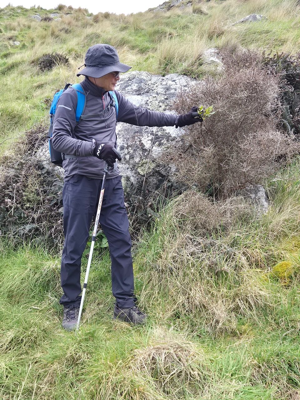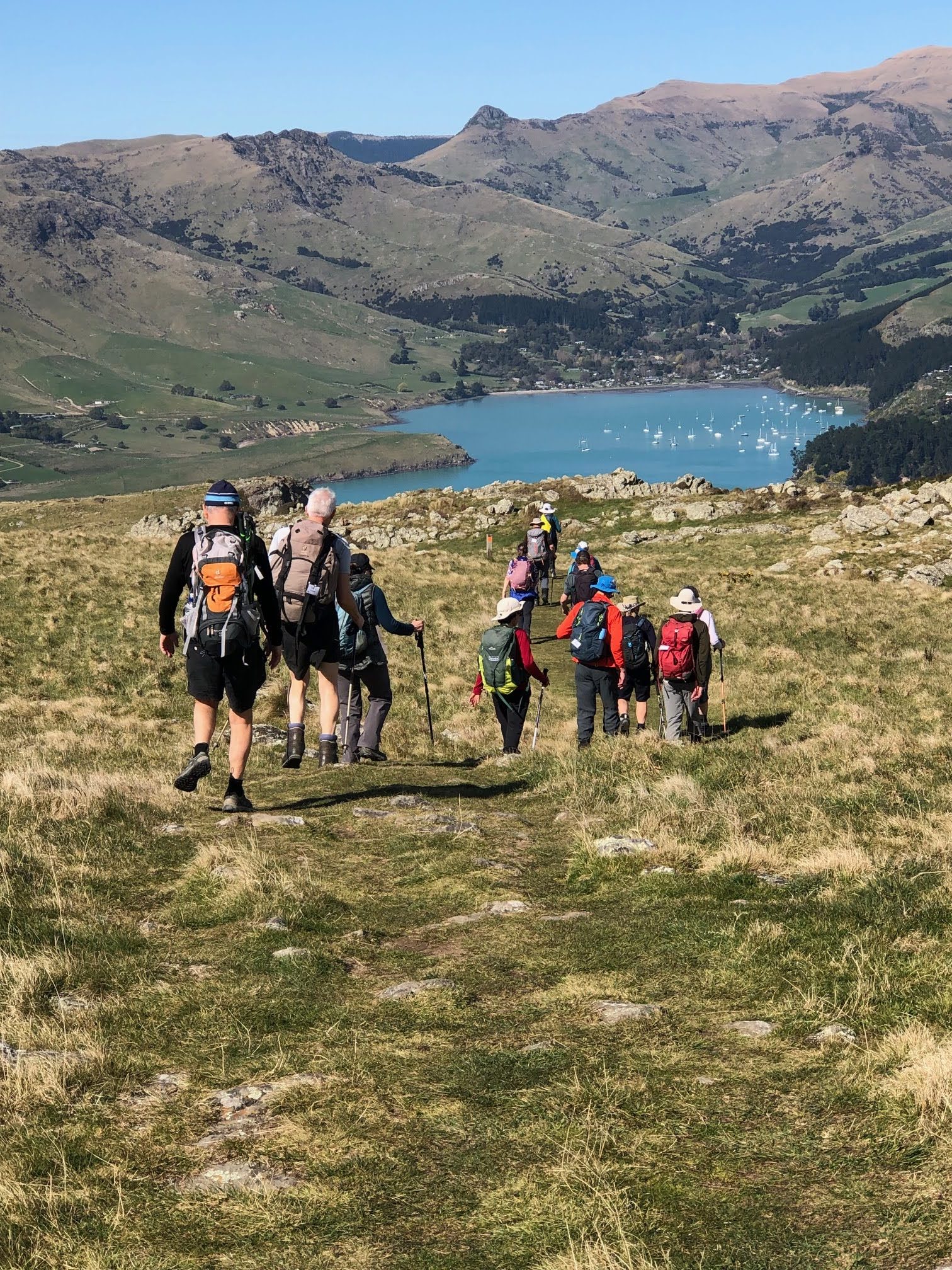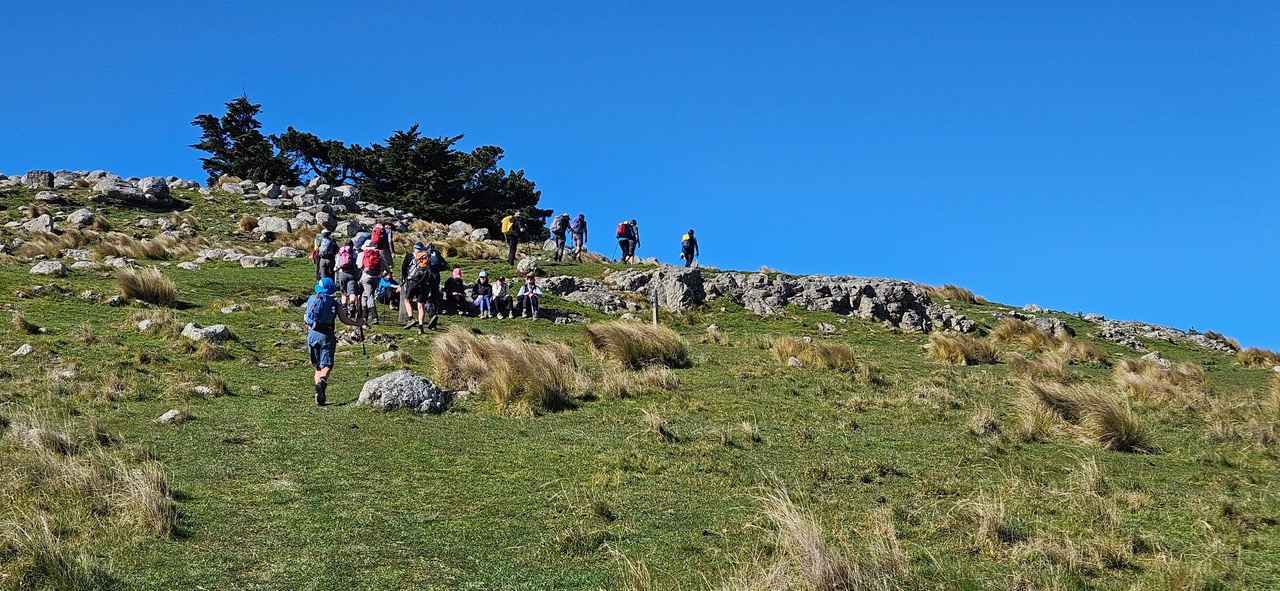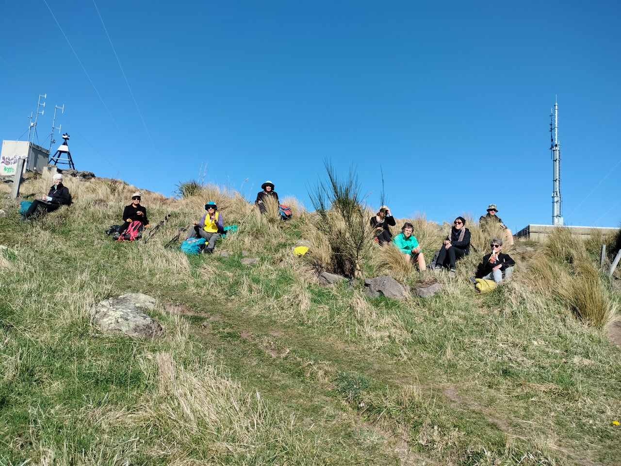With few clouds in the sky, we were hopeful of completing our walk by 1500 hrs ahead of forecast rain and hail. After leaving behind the 19 standards at McCormacks Bay Reserve, the 12 alternates were driven to the start of John Britten reserve. We set off at 0920 hrs, walking uphill to the bleating of ewes and errant lambs. Upon reaching the Mount Pleasant aerials, morning tea stop was announced at 1015 hrs. The NW wind had been decidedly fierce on our ascent and it was a pleasure to be sitting in a sheltered spot with a view of Pegasus Bay. The break was also spent swatting away bothersome flying insects.