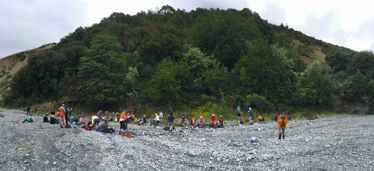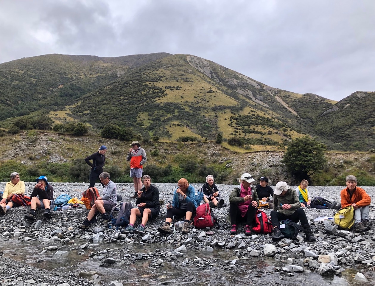 The Alternates arrived at the hut as the Standards were preparing to leave. Each group had the chance to inspect the hut with its four bunks and a “First Aid and Food” cabinet beside the door. After lunch, it was back to the carpark via the same path. The Alternates avoided the two river crossings by taking the shorter upper trail and descending back to the riverbed down the very steep jaunt through bush referenced above.