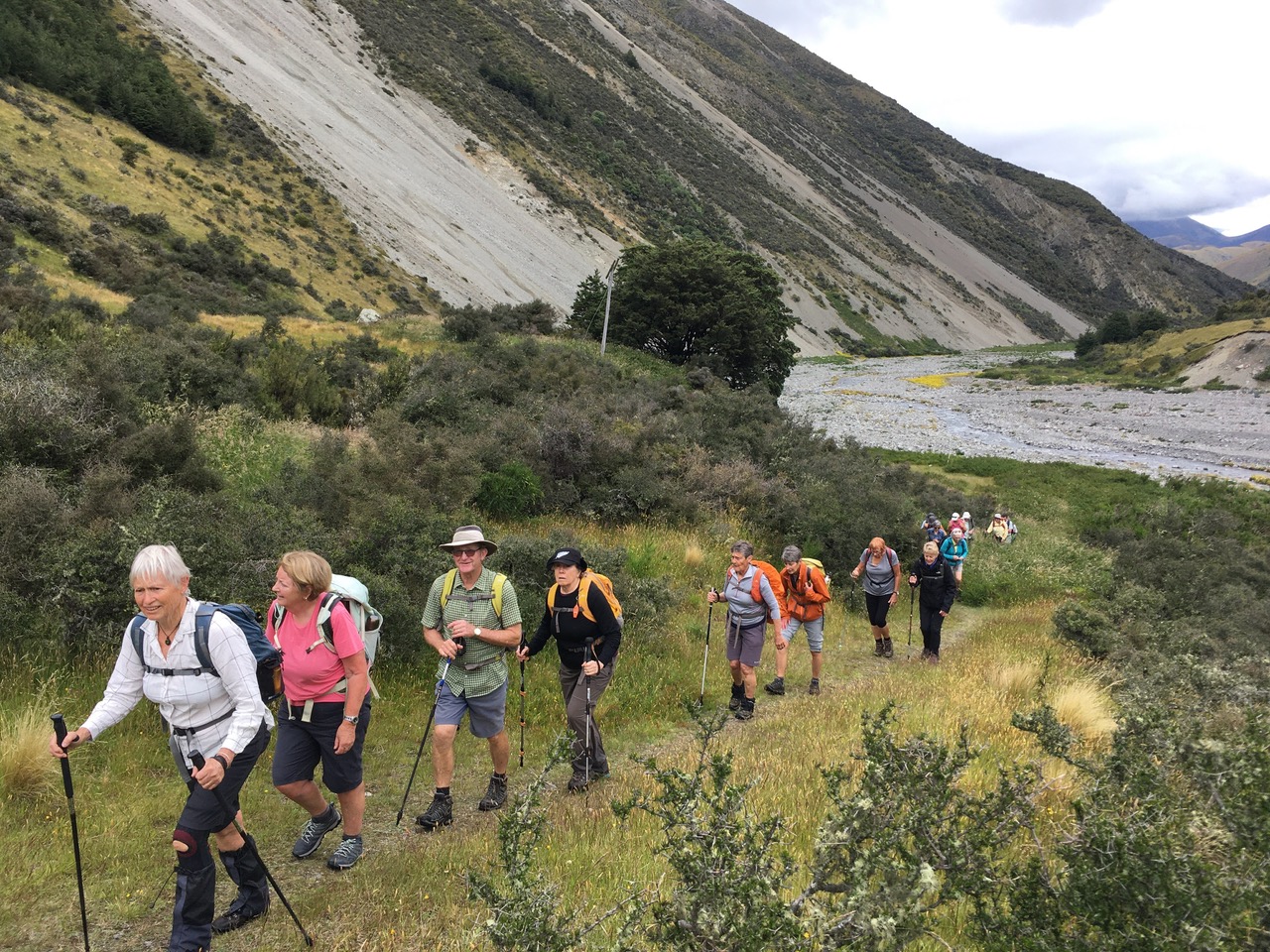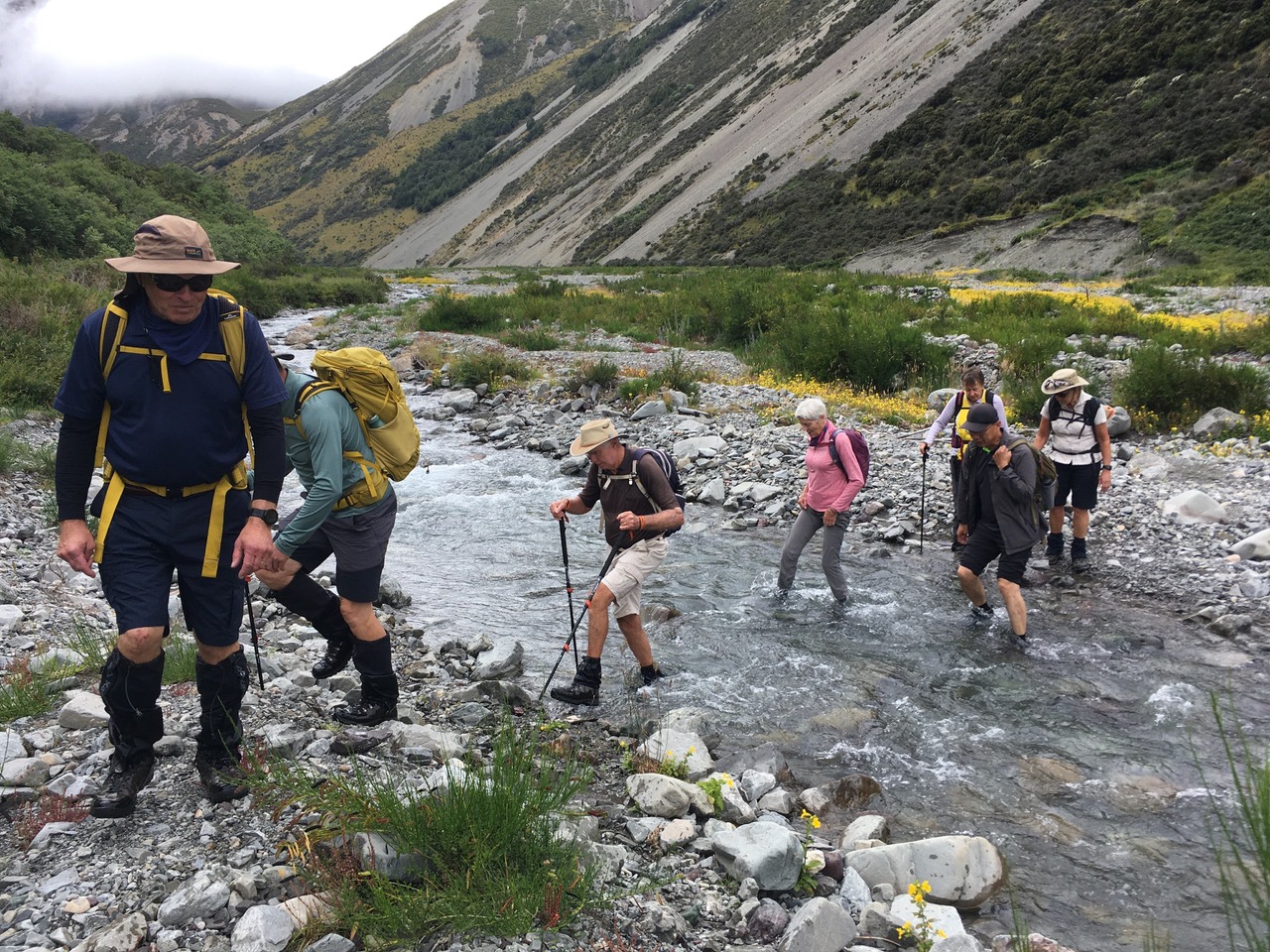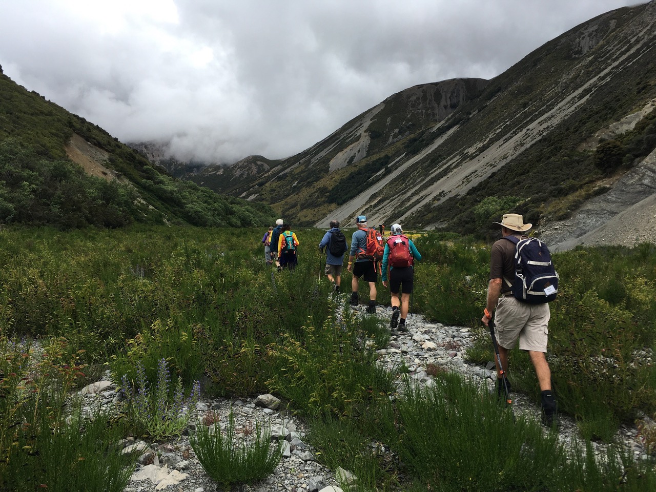 From there, the trail was flattish leading to morning tea on the riverbed edge. After that interlude, some of the Standards continued up the riverbed while others immediately went up a short but quite steep jaunt through bush to the trail leading to the hut. The Alternates continued up the riverbed as well, necessitating two crossings of the river which was below knee high but which was moving quite swiftly. Those of us inexperienced “river crossers” appreciated those of more experience (including our visitor Don) seeing us safely across both crossings.