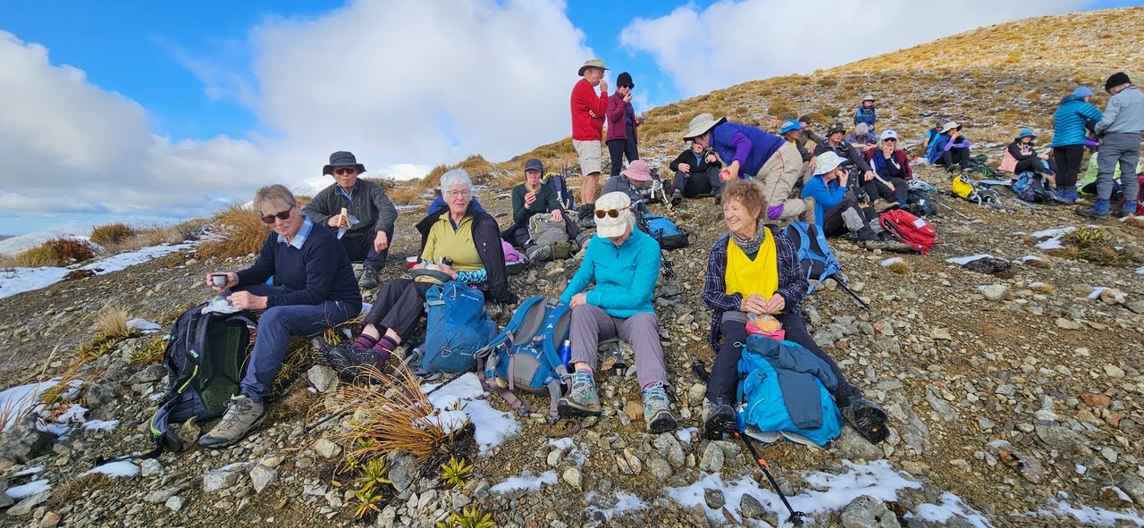 Rabbit Hill, 1198m is quite cruel as just when you think you have reached the summit there is a higher point to come. Standards enjoyed lunch at 1pm after walking along the ridge from the summit to find a little more shelter. Magnificent views to take in of Lake Coleridge and the snow covered Southern Alps. Alternates tell me they sighted  a red admiral butterfly at the summit. No photographic record but I’ll believe them.