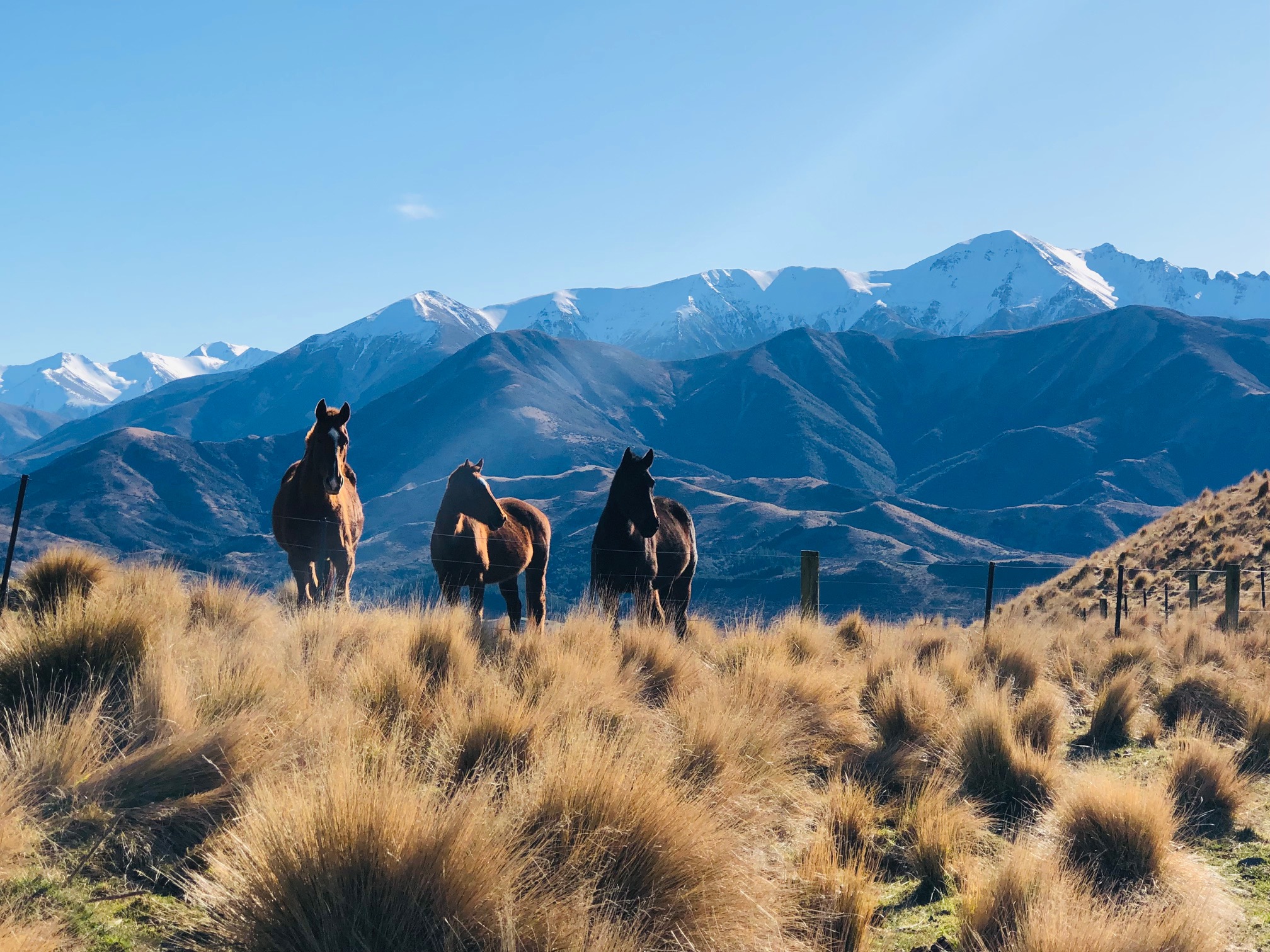 Some horses came to their fence to investigate this large group of intruders who had invaded their tranquil environment.  They presented a beautiful photographic opportunity with the snow covered Torlesse Range behind them.