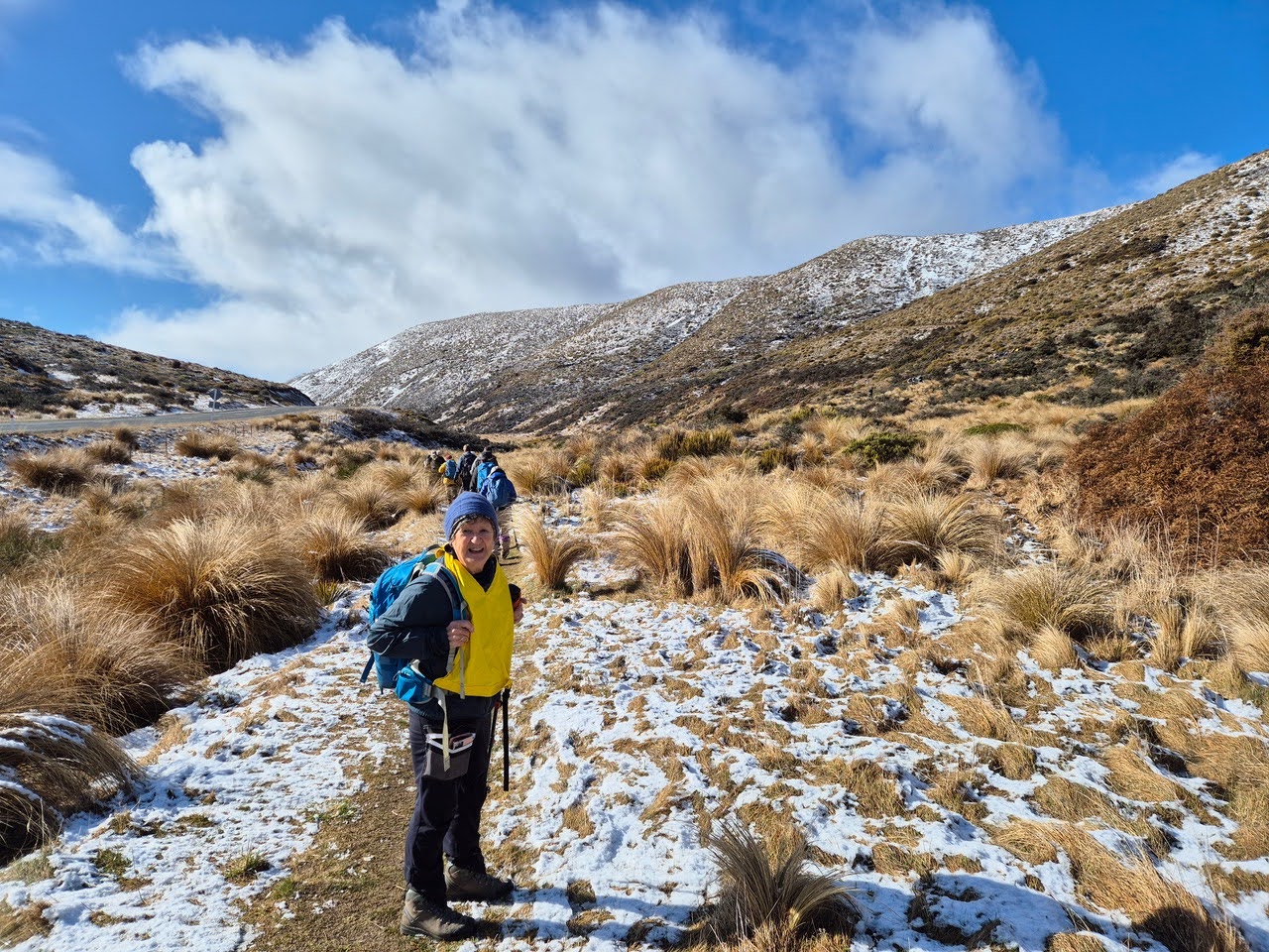 After morning tea, with the snow covered alpine tussocks sparkling in the sunshine, it was a satisfying sound to hear the crunch of our boots as we made our way up and along the ridge to reach TRIG M, 1251m at 11.30am.  Time was spent admiring the view, taking photos and some let off steam throwing a few snowballs.