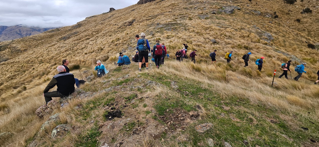 We soon arrived at the crest of Gebbies Pass, the short bus journey making a nice change. The group of 25 Standards were soon headed upwards closely followed by the 13 Alternates. As the forest is still being felled in different areas the track can change between our annual visits. Steve did a good job of keeping to the well-marked path although he caused a little consternation when he invited his group to “Get their gear off”. Perhaps it’s a reflection of our age that we may have been more excited if he’d said, “Get your sandwiches out!” However, the steadily uphill route saw hats, neck warmers, gloves, jackets and vests being discarded at various times.
