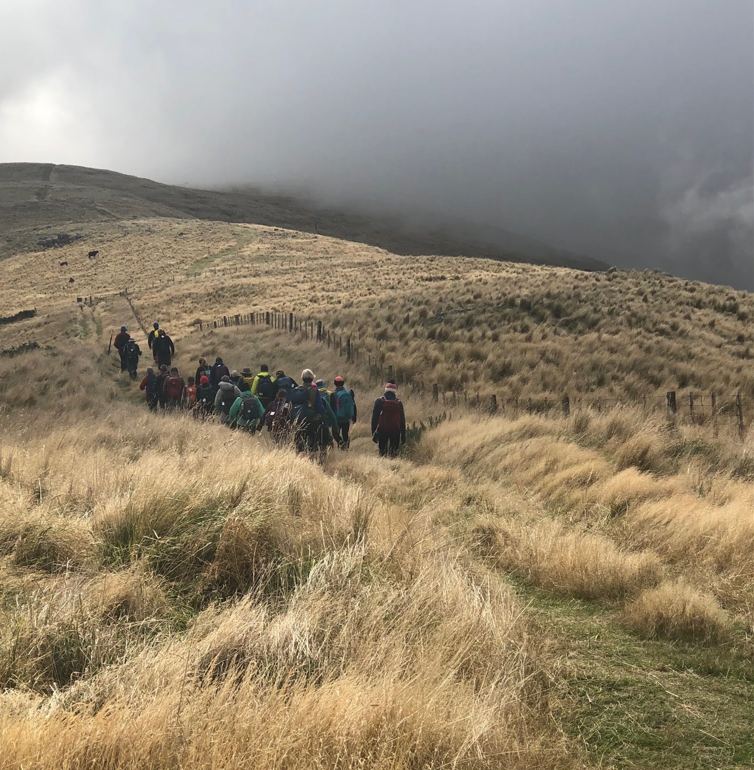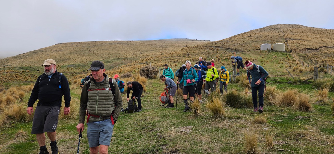 There may have only been 38 of us keen trampers (including guests Cait and Stuart) setting out from Castle Hill Village, but after about 10 days of drizzle and rain we were all set to enjoy this superb tramp. We definitely were ‘all set’ as there were gloves, raincoats, and even some over-pants donned in the expectation that we’d be trudging all day in the cold and wet. The fog we’d encountered along the way had done nothing to make us feel more confident about the weather. However, within half an hour of steady uphill walking, multiple layers were shed as the weather was actually quite pleasant.