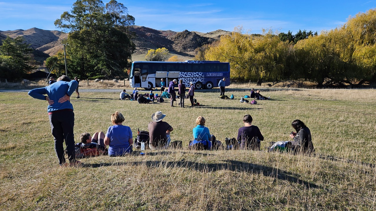 On a clear sky morning with a promising forecast for sunshine, 36 trampers with bus driver Tony departed Yaldhurst promptly at 8.45am. As we headed west, I think some trampers from last week were relishing the thought of an upright day with no prolonged bending or spade work. President Jen welcomed everyone and advised Bruce H was now a member of BTC. A pair of woman’s size 12 zip-off Kathmandu walking pants were going free for anyone interested. Not sure if they have been snapped up (enquire next week).