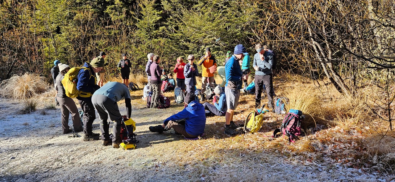 At 10.20am 26 Standards were dropped at Mistletoe Flat at Broken River and set off at a steady pace up the ski field access road where the ground was sparkling with the heavy frost. Hats and gloves were the order of the day for most. At 10.40am, when a sunny grassy clearing appeared, it was time for morning tea. The tailender had competently carried out all aspects of his role but had violated the dress code. He was advised the high vis vest was to be worn over his head not draped over his backpack. He obediently obliged.