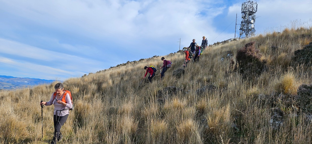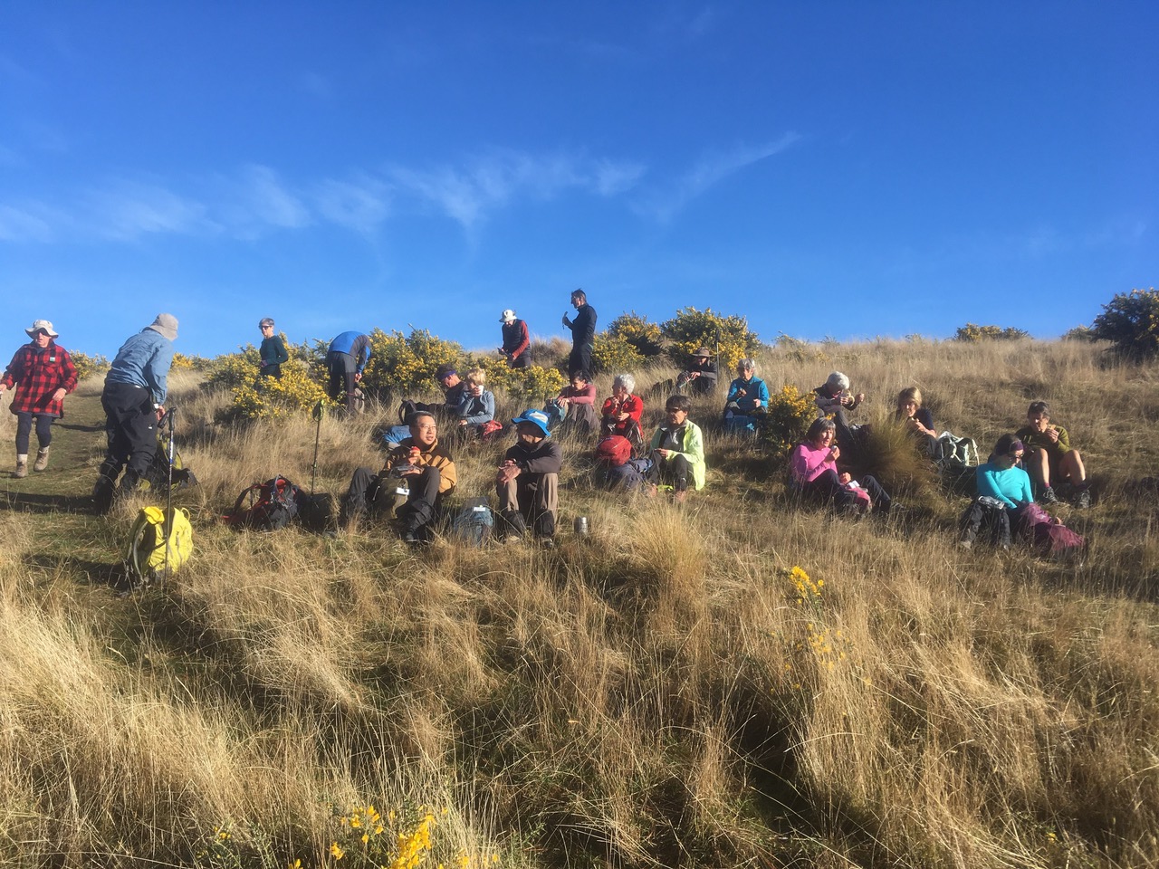 The Standards made it to the last steep climb, negotiated the difficult barbed wire fence and chose lunch spots near the trig at the top of Mt Alexander. The Alternates, who arrived soon after, favoured possies closer to the massive radio masts. In fact, the view from anywhere at the top was superb – all the way down to the Waikari basin, across to Lake Sumner, the snow-capped Southern Alps in the distance, and the Kaikoura range far away to the north. Eating our lunch with no wind to contend with and with sunshine on our faces was just blissful. Even a discussion on the sad state of US politics couldn’t cast a shadow of gloom on the participants.