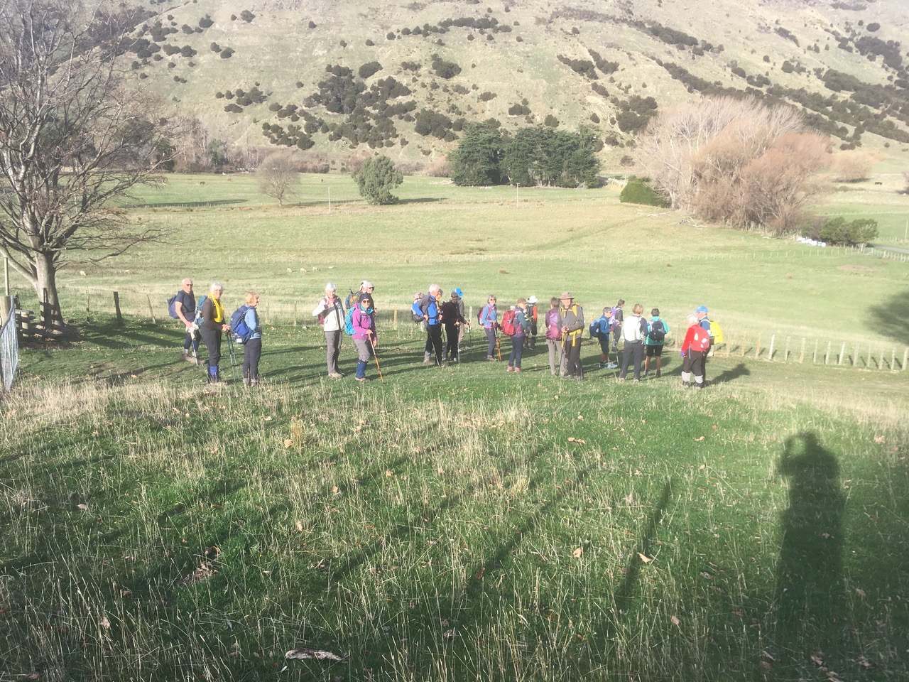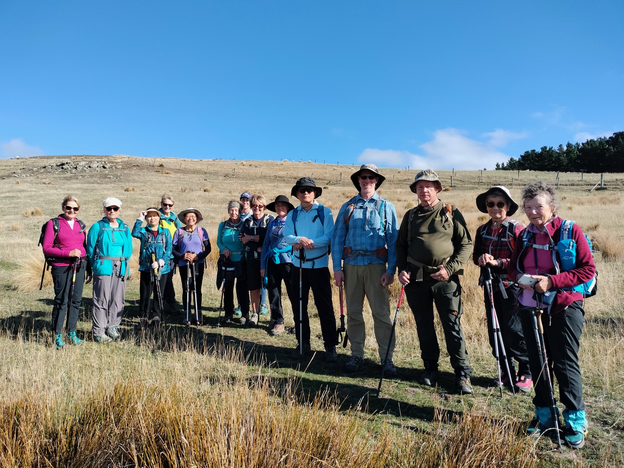 Leaving Bishopdale in high spirits with the promise of a pleasant farm walk in North Canterbury ahead, we were all delighted to see Viktor as he has been on other driving duties for the last few months. Jen welcomed us in a number of languages and may have to add Viktor’s first language to these. We made good time up the main road north and soon pulled over opposite the Greta Valley pub. We quickly divided into our two groups – 27 walking with the Standards and a small group of 11 with the Alternates. The first pleasant surprise was that the tricky fence did not have to be negotiated as this year the gate was unlocked. We all poured through gratefully, especially those of us who had torn our shorts the week before and really didn’t want to have to consign a second pair to the bin had the barbed wire etc been misjudged. The wide track winding steadily uphill provided good conditions underfoot and the weather was perfect – warm sunshine and not a breath of wind. We all enjoyed the rest provided by the morning tea stop and the opportunity to take in the surrounding countryside.