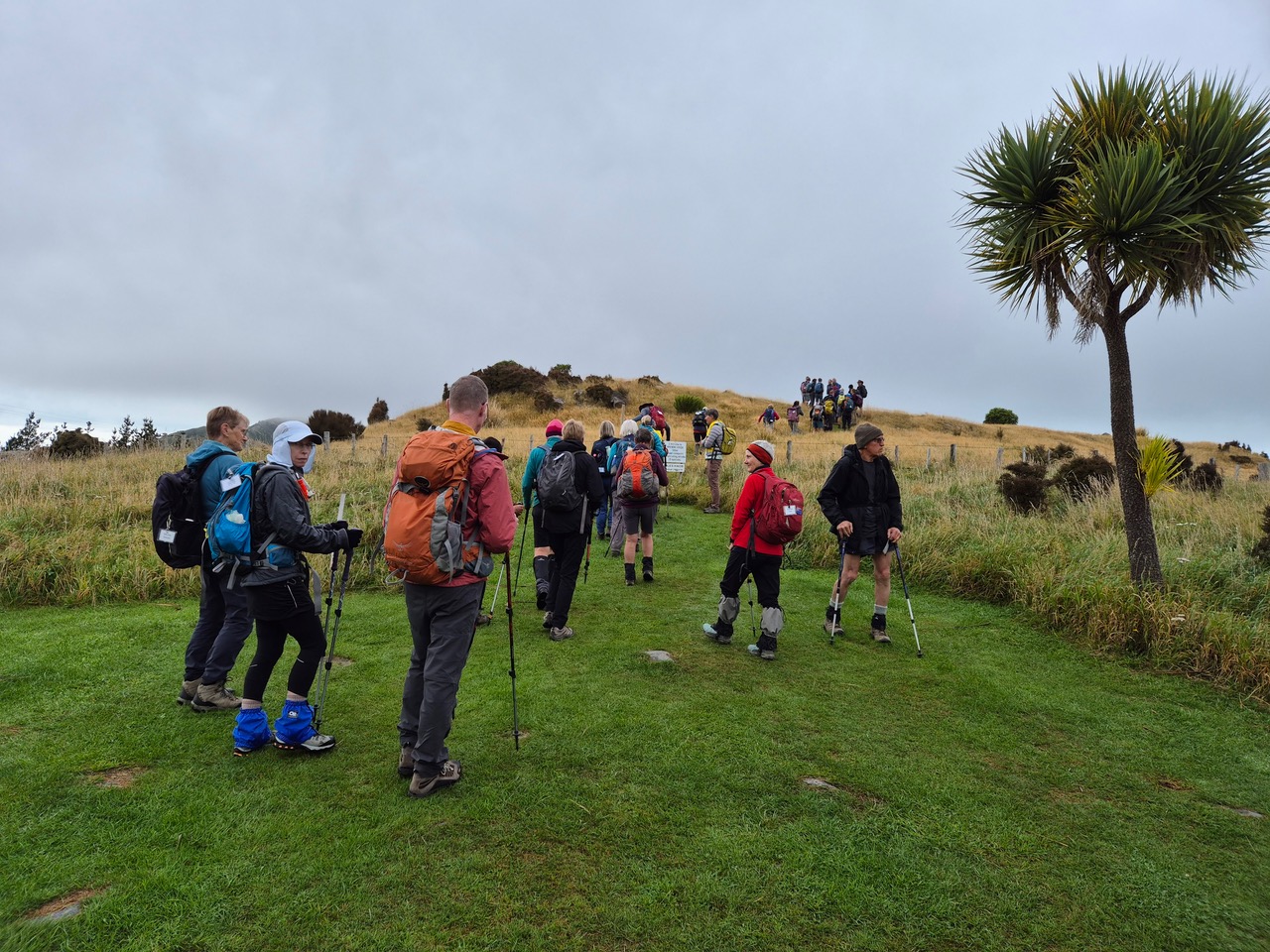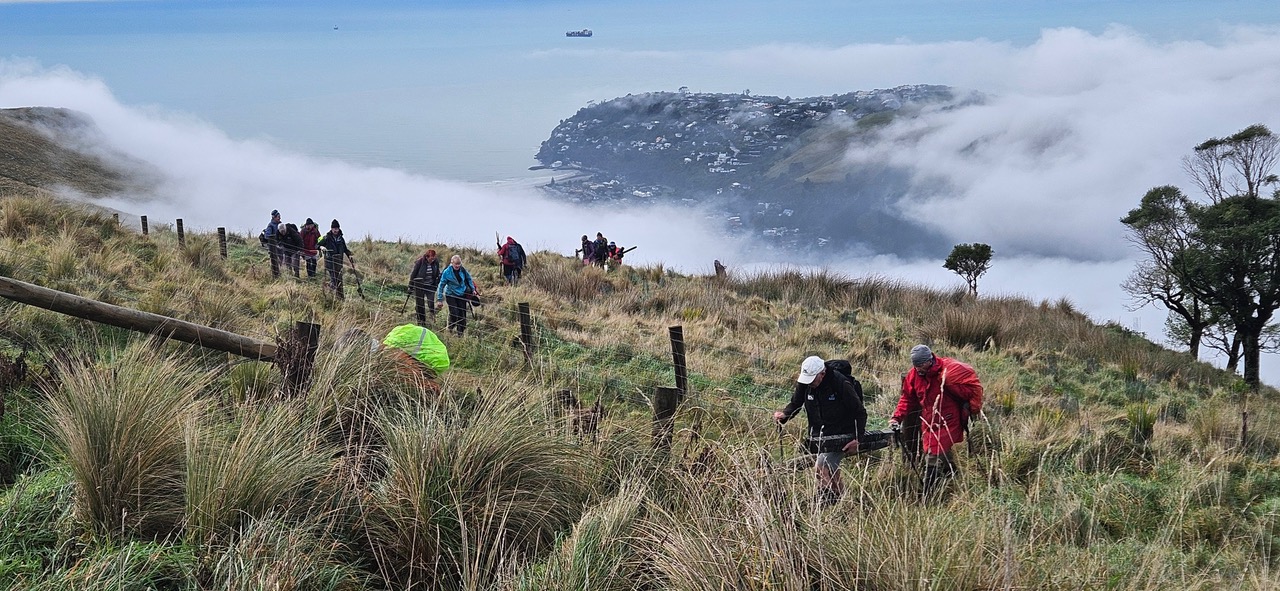 On a dismal misty morning, despite a not very flash forecast, 32 trampers set off on our annual tree planting day at Greenwood Park, in the Port Hills. After a short ten-minute walk we arrived at our planting area, at 10am, directly above Jollies Bush and overlooking Sumner.