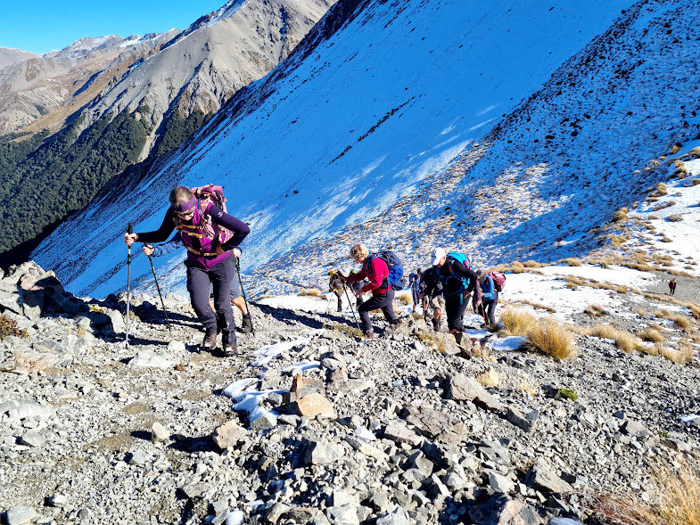 On a crisp and clear late autumn morning 21 of the 33 trampers set out from Mistletoe Flat for this season’s Camp Saddle circuit. Judging by a few recent emails this trip was keenly anticipated. Also, being a little later than usual in the season and after a few southerlies over the last month, some discussion on the bus revolved around encountering snow and ice on the route. We were not disappointed.