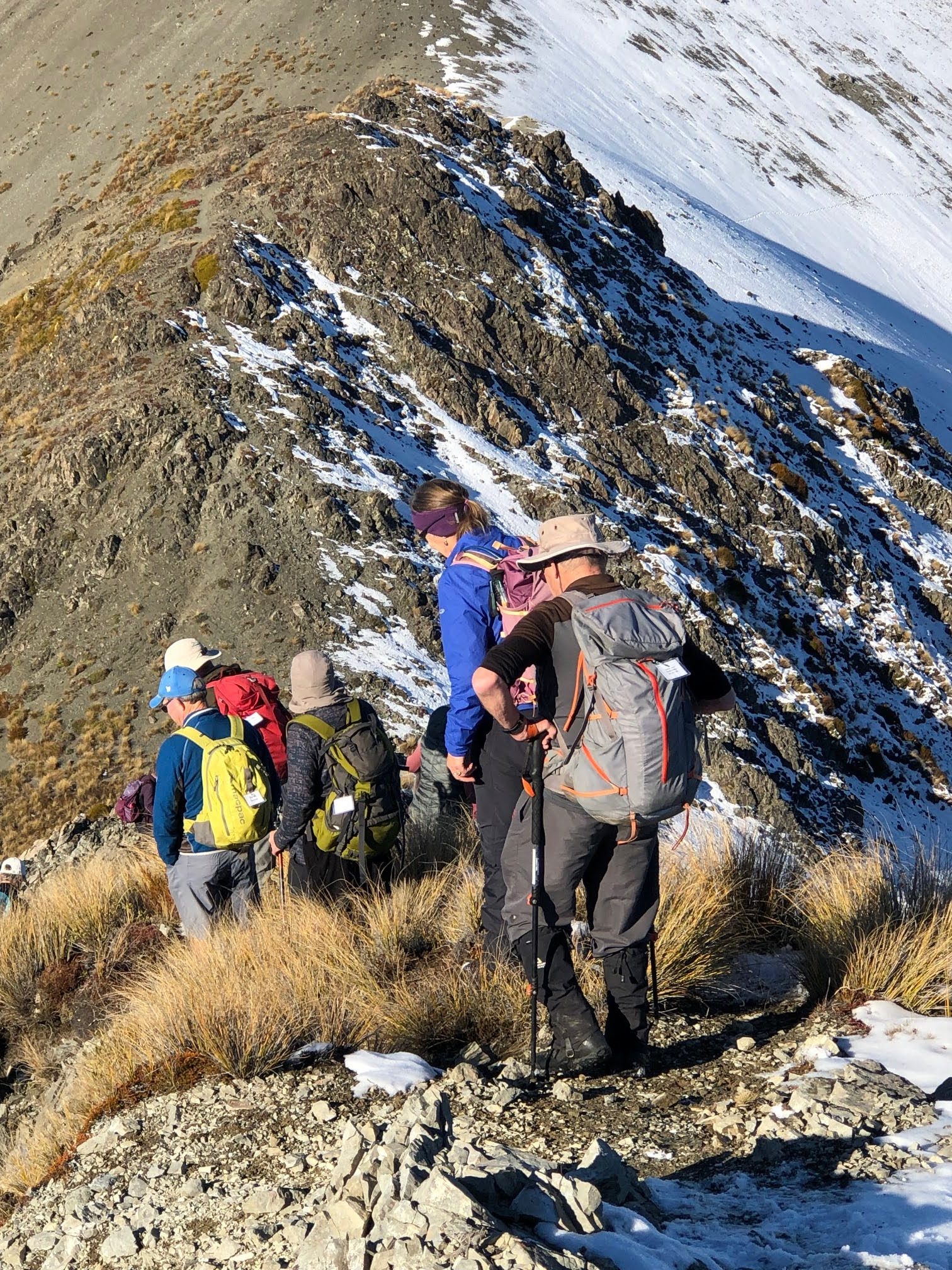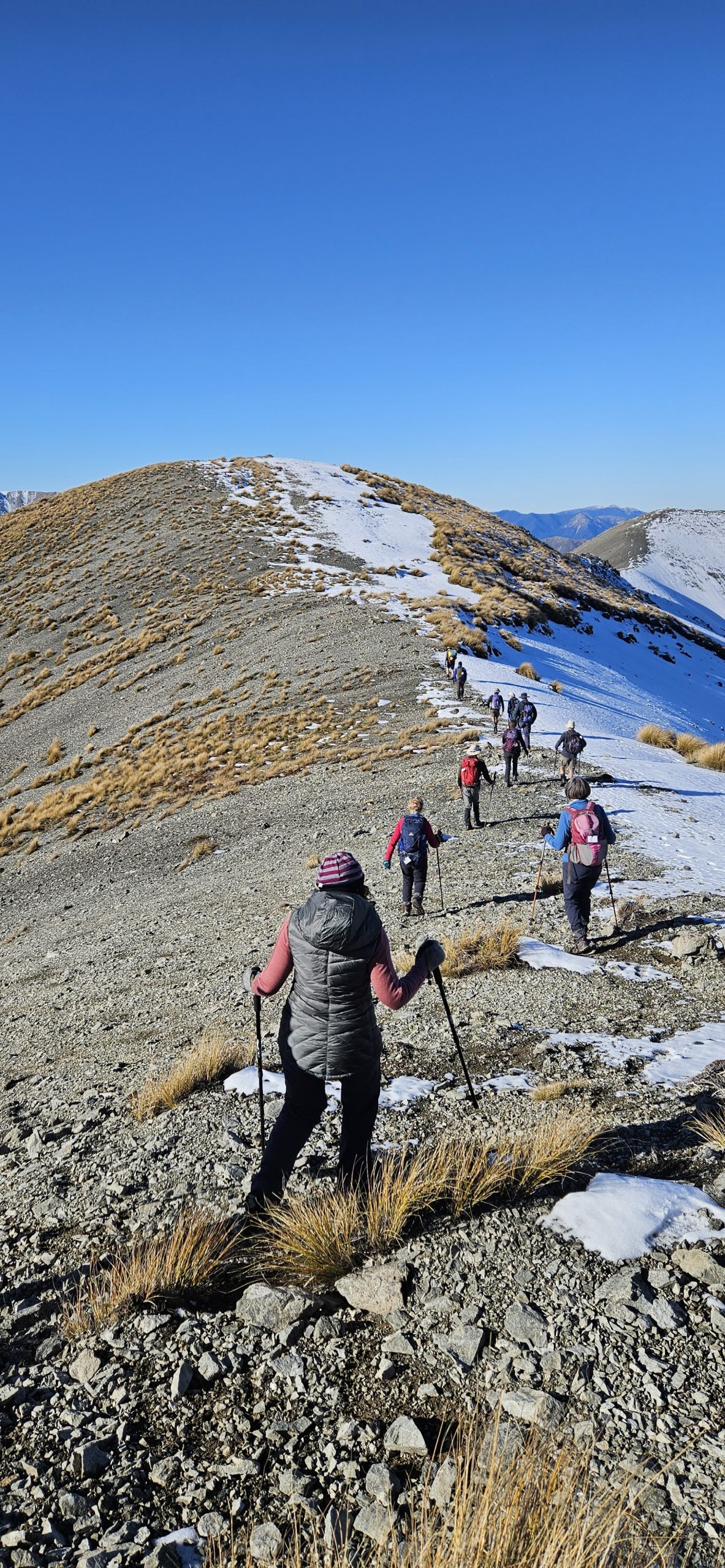 After our lunch break we walked for about 3km along the undulating and, in some parts, gnarly south east ridgeline encountering light snow and ice in patches where careful footing was required. Everyone negotiated this travel well which brought us to the top of the scree slope for our descent and access, for our return, via the Luge/Mistletoe track.